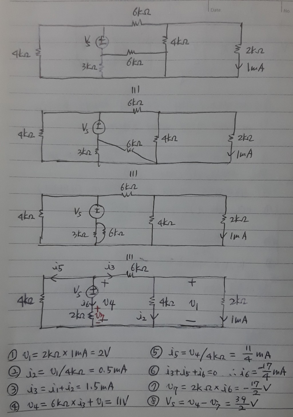 주어진 문제는 Vs=24V일 때 Io를 구하는 것이지만 선형성(비례성)을 이용한 풀이는 Io=1mA일 때 Vs를 구한 다음 비례식을 이용하여 Vs를 구하는 것입니다. 자세한 풀이는 아래 사진의 내용을 참고하시기 바랍니다. 우선 회로를 다루기 편하게 변형한 다음 순차적으로 각 소자의 전압, 전류를 구하여 최종적으로 Vs를 구합니다.