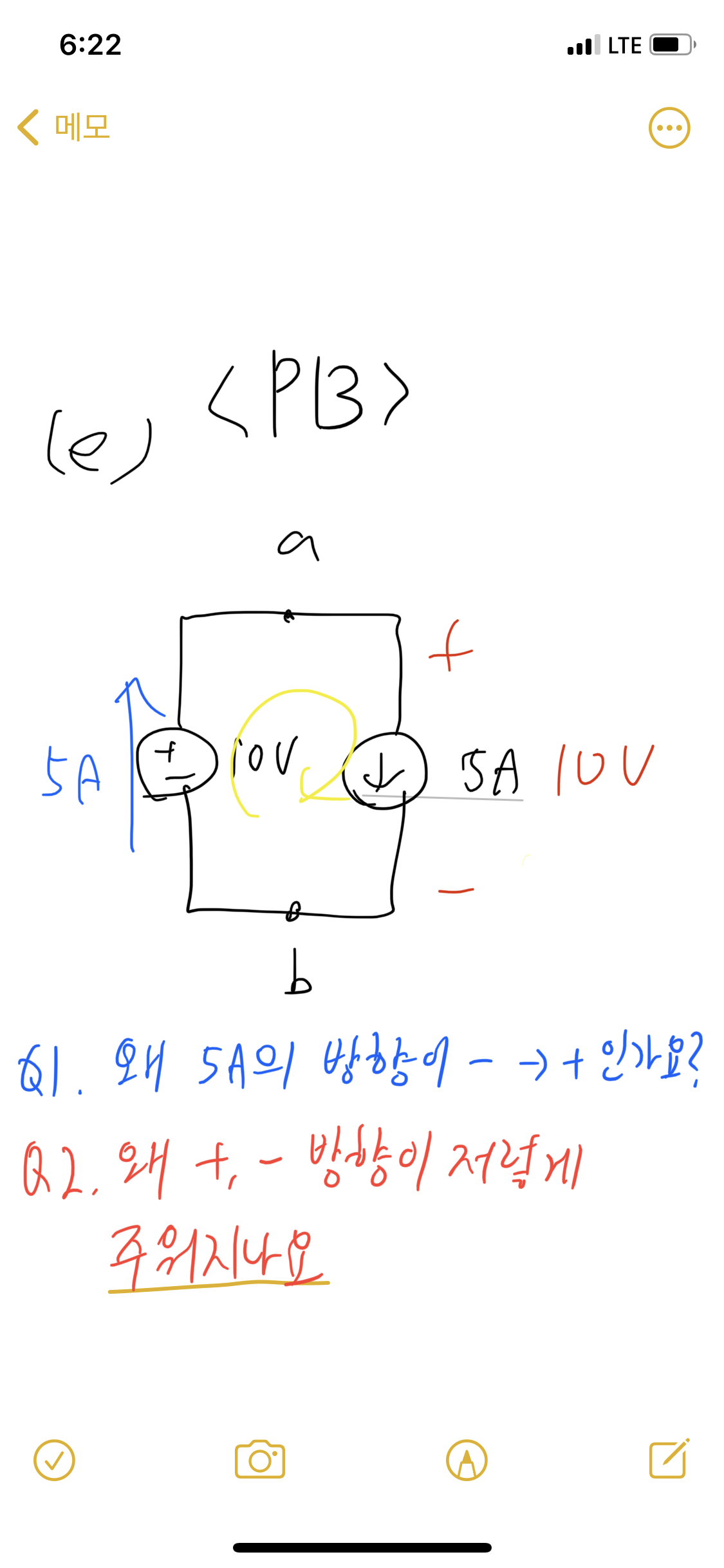 2. 전압원과 전류원이 병렬연결이므로 두 소자의 전압이 같습니다. 그래서 전압원의 +- 극성이 그대로 5A 전류원에 걸립니다.