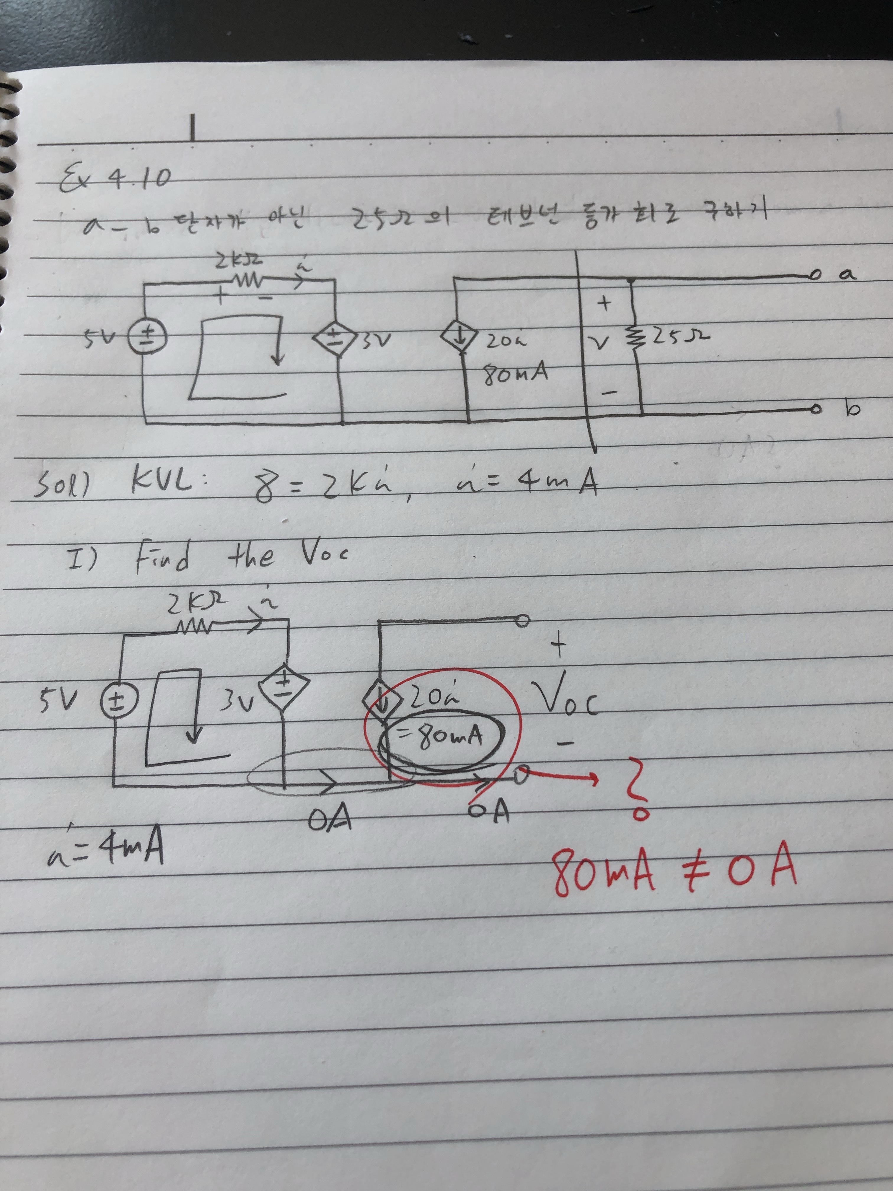 i=80mA가 나왔으므로 이는 앞서 설명한 노턴등가회로만 존재하는 회로에 해당합니다.