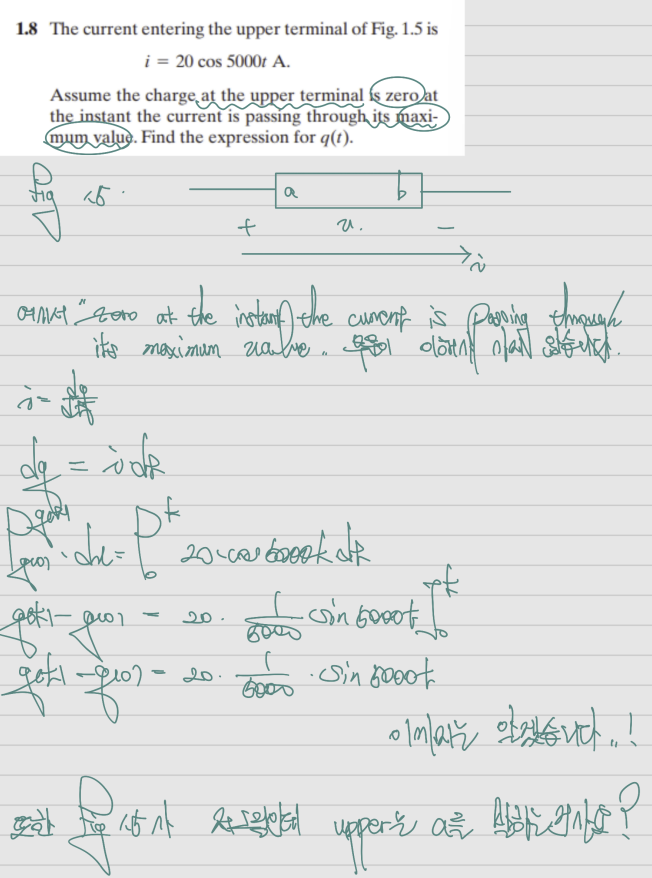 부정적분을 하면 q(t)=∫i(t)dt=20/5000*sin5000t+C(C는 적분상수)