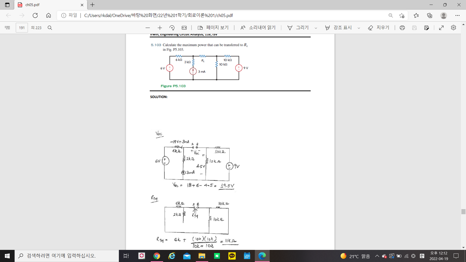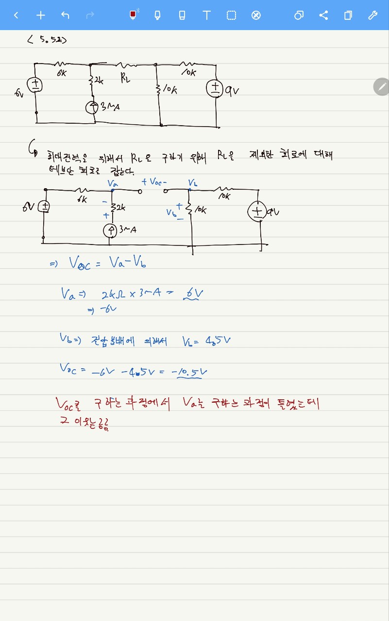 문제는 저항 R_L 의 최대전력전달을 구하기 위해 테브낸 등가회로를 만들기 위해 V_oc를 정의하는 과정에서 V_a를 설정하는 과정에서 솔루션과 풀이가 다르지만 그 이유르 잘 모르겠어서 질물드립니다. 문제와 솔루션 , 제 풀이를 첨부하였습니다! 상세한 설명 부탁드립니다!