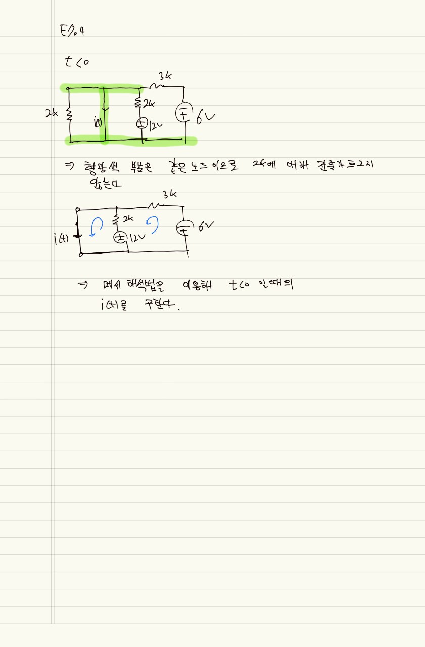 (해당 문제의 경우 회로의 아래 마디를 기준마디로 두면 제일 위 마디전압은 0V이므로 여기서 KCL을 쓰는 것이 미지수가 i(0-) 하나여서 좀 더 편리합니다.)