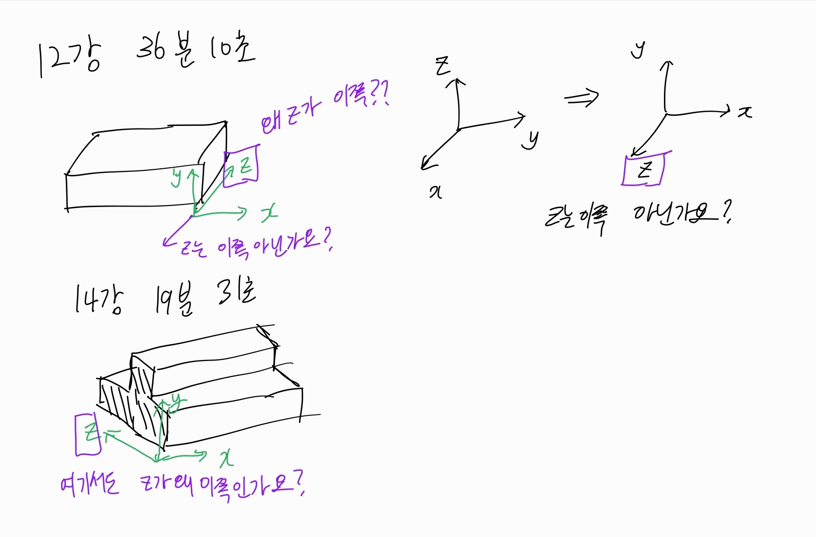 안녕하세요 교수님 단면모멘트 축방향에 대해 질문드려요 첫번째 사진에서 보면 강의 12강 36분 10초, 강의 14강 19분 31초에서 각각 단면모멘트 구할 때 축 방향을 저렇게 설정하셨습니다. 그런데 x와y의 +방향 축이 각각 정해졌을 때 z의 +방향 축은 제가 그린 방향으로 되는것아닌가요?