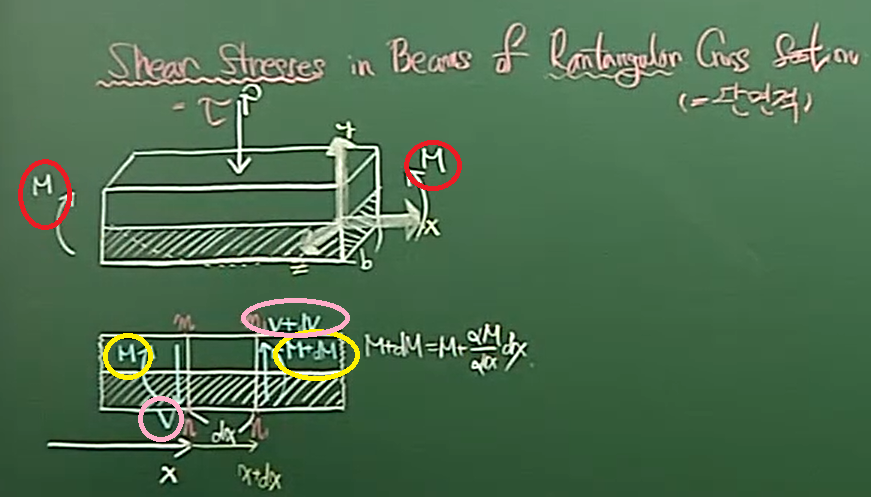 그리고 만약 이렇게 거리가 차이가 나면 모멘트값도 달라지는 것이 맞다고 하였을 때, 1.보의 맨 왼쪽 끝에 걸리는 모멘트를 M이라고 하면 아래사진에서 mn영역에서 걸리는 모멘트값은 M이면 안되는것 아닌가요? 보의 맨 왼쪽을 기준으로 지금 거리 x만큼 떨어진 곳이 mn이니까 여기 값도 M+ x*(dM/dx)가 되어야 하는 것 아닌가요? 왜 노란색 왼쪽 동그라미는 위의 빨간동그라미와 마찬가지로 M으로 되는건지 모르겠습니다.