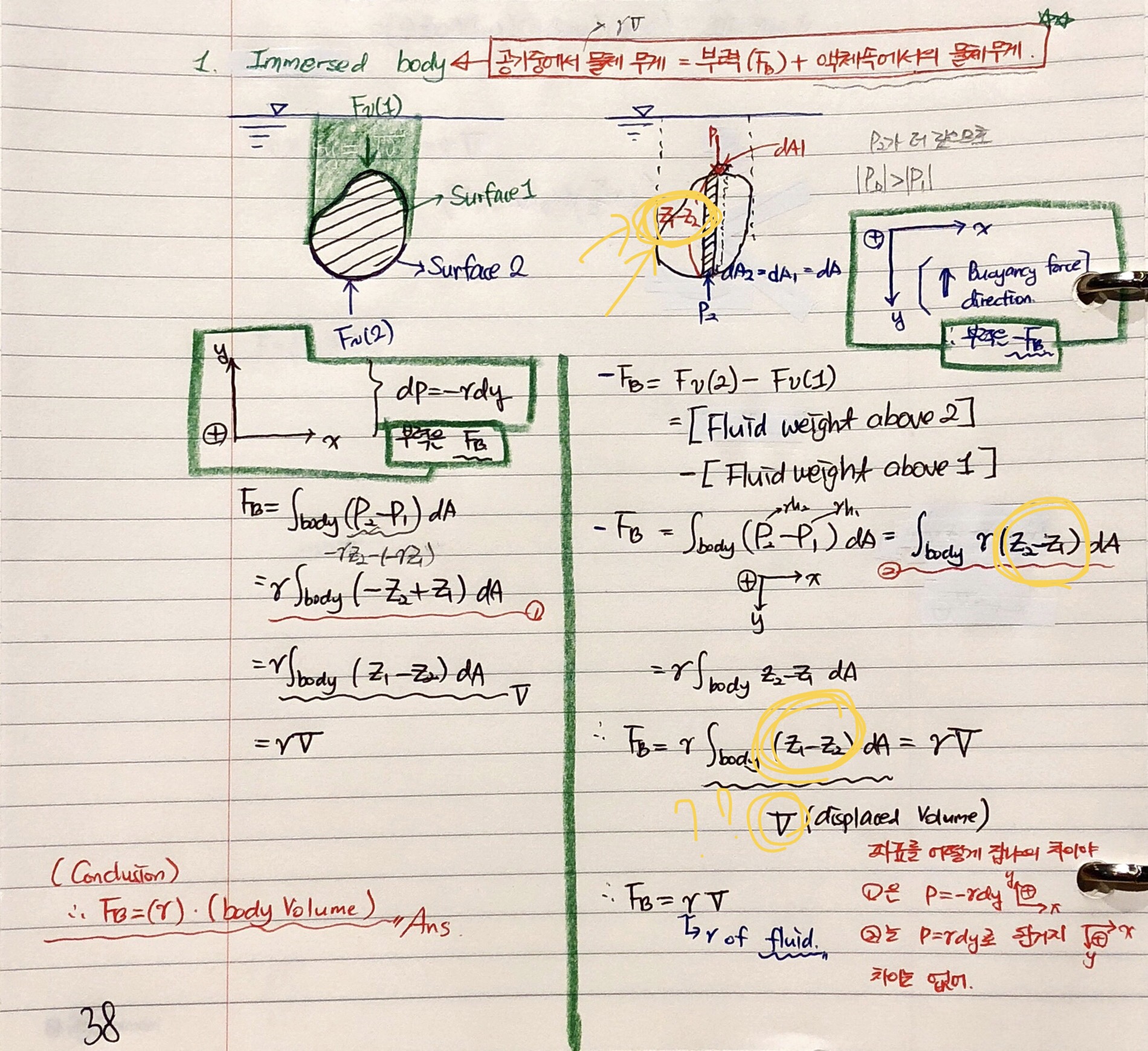 부력이란 것은 결국 z방향에 따른 Pressure Gradient입니다. 아래를 양수로 잡으면 dP=γdy 가 되기 때문에 이를 이용하여 P2와 P1을 구할 수 있고, 부력은 결국 P2-P1이기 때문에