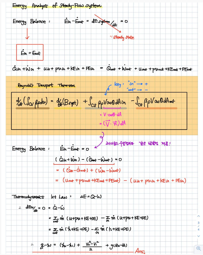 이부분에서 왜 들어오는게 -고 나가는게 + 일지 많은 고민을 해봤습니다. 레이놀즈 수송정리할때처럼 컨트롤볼륨안에 들어오면 - 나가면 + 로 이해해야할지, 아니면 유동"일" 이므로 control volume 유체가 압력을 가지고 들어오면, control volume이 유체의 inflow 압력에 의해 압축되는거로 생각해서 일을받은거니까 -, outflow 압력에 의해 control volume이 팽창해서 + 인건지.. 명확하게 구분이 안 서네요.