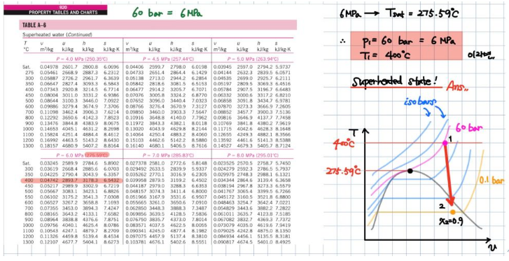 안녕하세요! 강의중에 example 문제 풀어주실때 저기 온도 부피 그래프에서 왜 60bar를 가운데, 즉 습증기상태일때 표시 하신건가요? 분명 초기 온도 400도씨에서 압력 60bar 인데 그러면 steam turbine이니깐 끝부분에다가 60bar 적으셔야 하는거 아닌가요?? 제가 놓친부분이 어디인가요?? (점 찍으신부분이 궁금합니다 어떻게 거기 부분에 점을찍었으며 왜 60bar랑 0.1bar이 가운데인지...)
