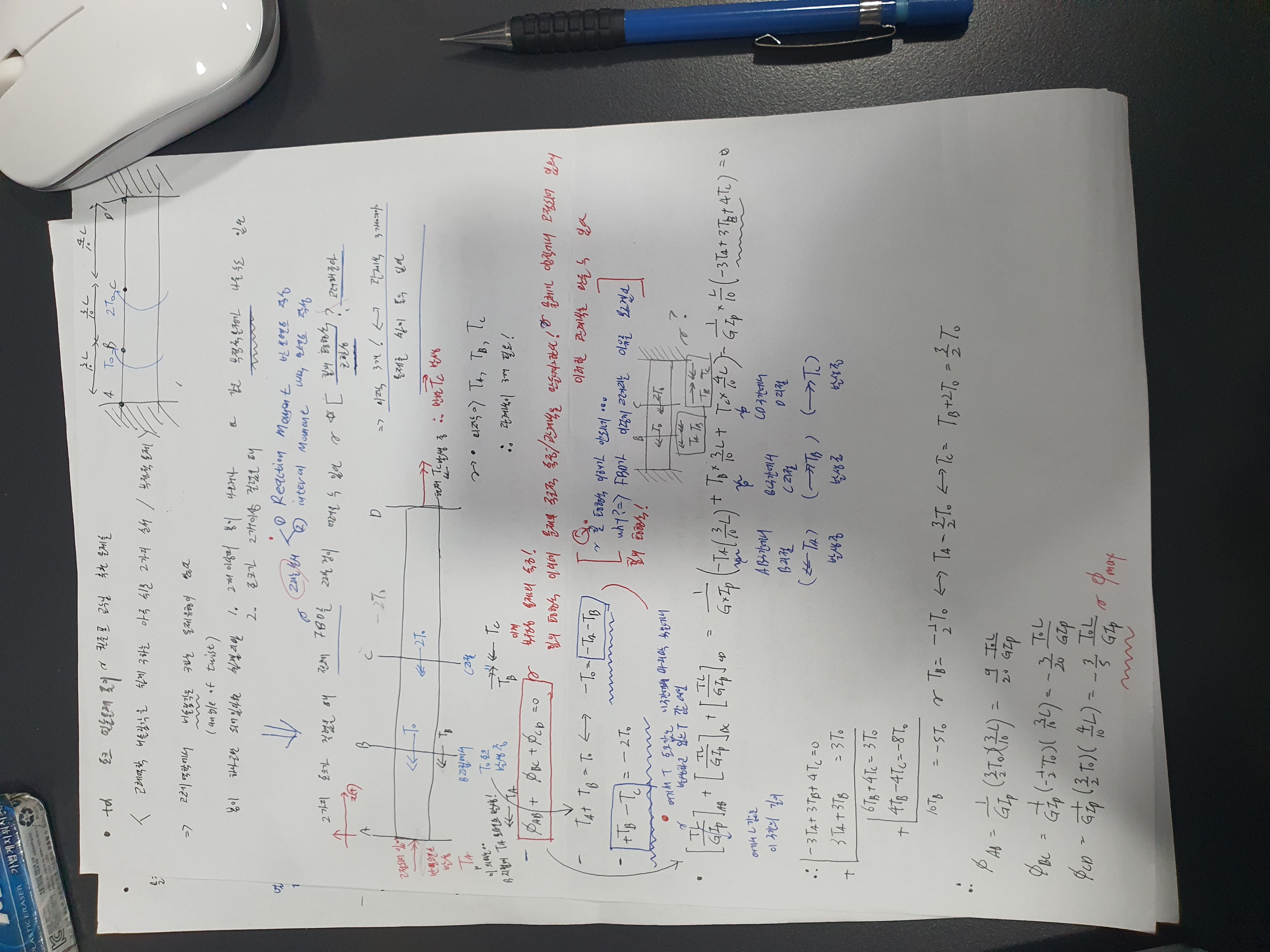 그리고 교수님께서 추가적으로 풀어보면 좋을 것 같은 관련내용도 올려주셔서 풀어봤습니다 1번째 추천문제 = One Rod w/ Two Torques /천천히 써보면서 풀어봤습니다 (사진) 전체적인 교수님의 문제를 풀어가는 과정은 이해가 됩니다 물론 스스로 제가 생각해서 풀 수는 없을 것 같습니다만...하하... 그런데 전체자유물체도 -> 힘의평형식 부분이 이해가 잘 되지 않습니다 어떻게 이렇게 힘들을 표현하신건지 어떻게 문제에서 주어진 그림을 파악을해서 이러한 관계식을 만들 수 있는건지 질문을 해도 될까요 To = Ta + Tb -2To = +Tb - Tc