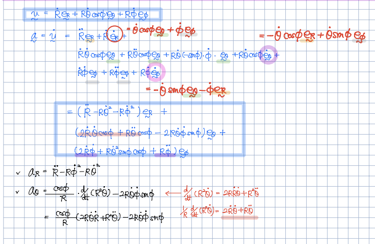 동역학 강의파일과 강의내용을 보면 spherical coordniate 에서 a 구할 때 계산 실수 하신 것 같습니다.
