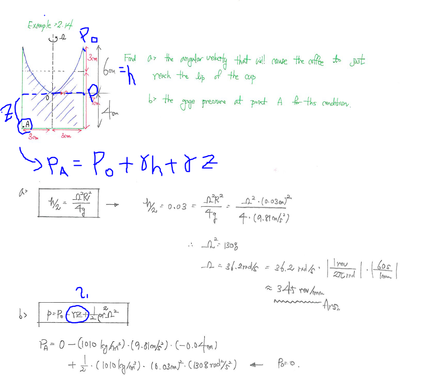 유체역학 실전 문제 풀이 4강에서 첫번째 예제 질문드립니다 교수님께서 등속회전운동에서 point A에서 압력을 첨부된 필기와 같은 식으로 알려주셨습니다. 해당 식에서 -r(비중량)*z에 대한 항이 이해가 되지 않습니다 등속회전운동에서 압력에 대한 식이 P=P0+rh=P0+(비중량*r^2*w^2)/(2*g)인 것은 [유체역학 한방에 끝내기] 강의에서 배웠습니다 예제의 그림에 제가 그려놓은 것과 같이 액체는 아래로 갈 때 압력이 증가한다고 하셨으니 -rz가 아닌 +rz가 되어야 한다고 생각합니다 P(A)= P0+rh+rz가 아닌 -rz항이 들어가는 이유가 궁금합니다. (그림의 필기는 노트북으로 하여 바르지 못합니다 죄송합니다)