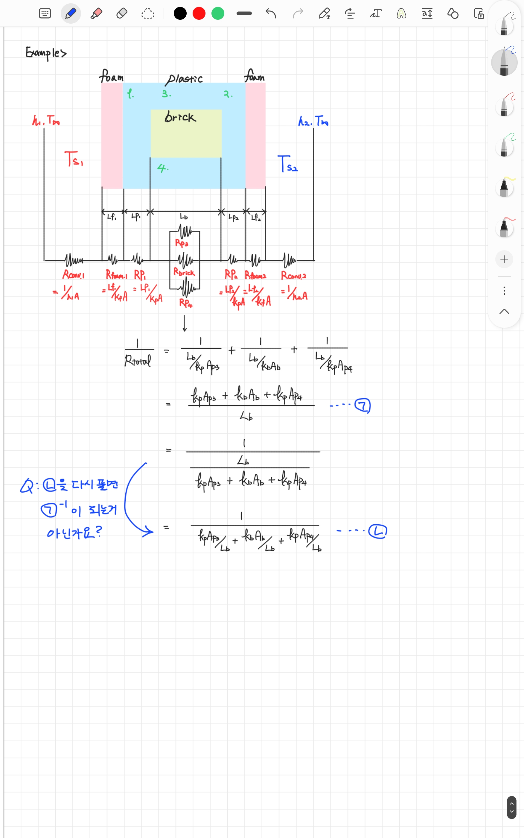 안녕하세요 교수님, 다름이아니라 8강 마지막부분에 나온 그림에 대한 Electrical Circuit Analogy에 대한 계산 질문이 있습니다. 첨부한 사진과 같이 ㄴ 부분을 다시 풀어보면 ㄱ의 역수가 되는거 같은데.. 이 부분이 이해가 가지 않습니다 ㅜ