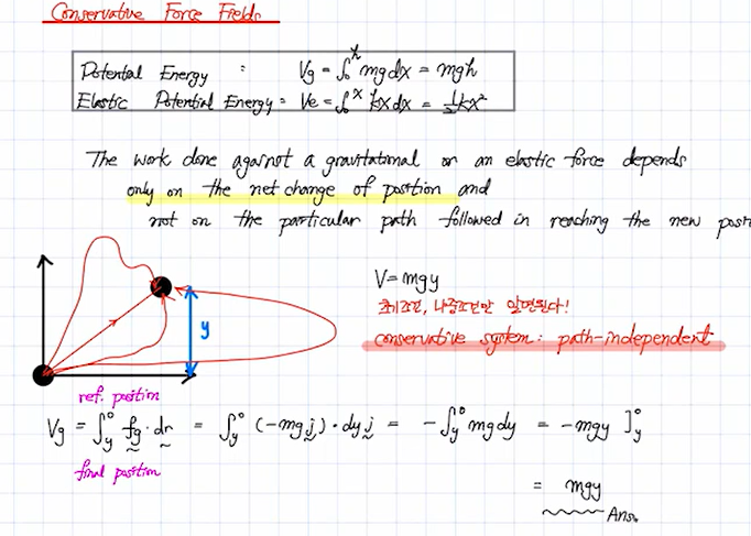 1.보존장에서 일을 구할때 보통 위쪽을 y+ 로 놓고 중력장은 y- 방향으로 작용 하므로 이에 따른 부호규약을 따지기 귀찮아서