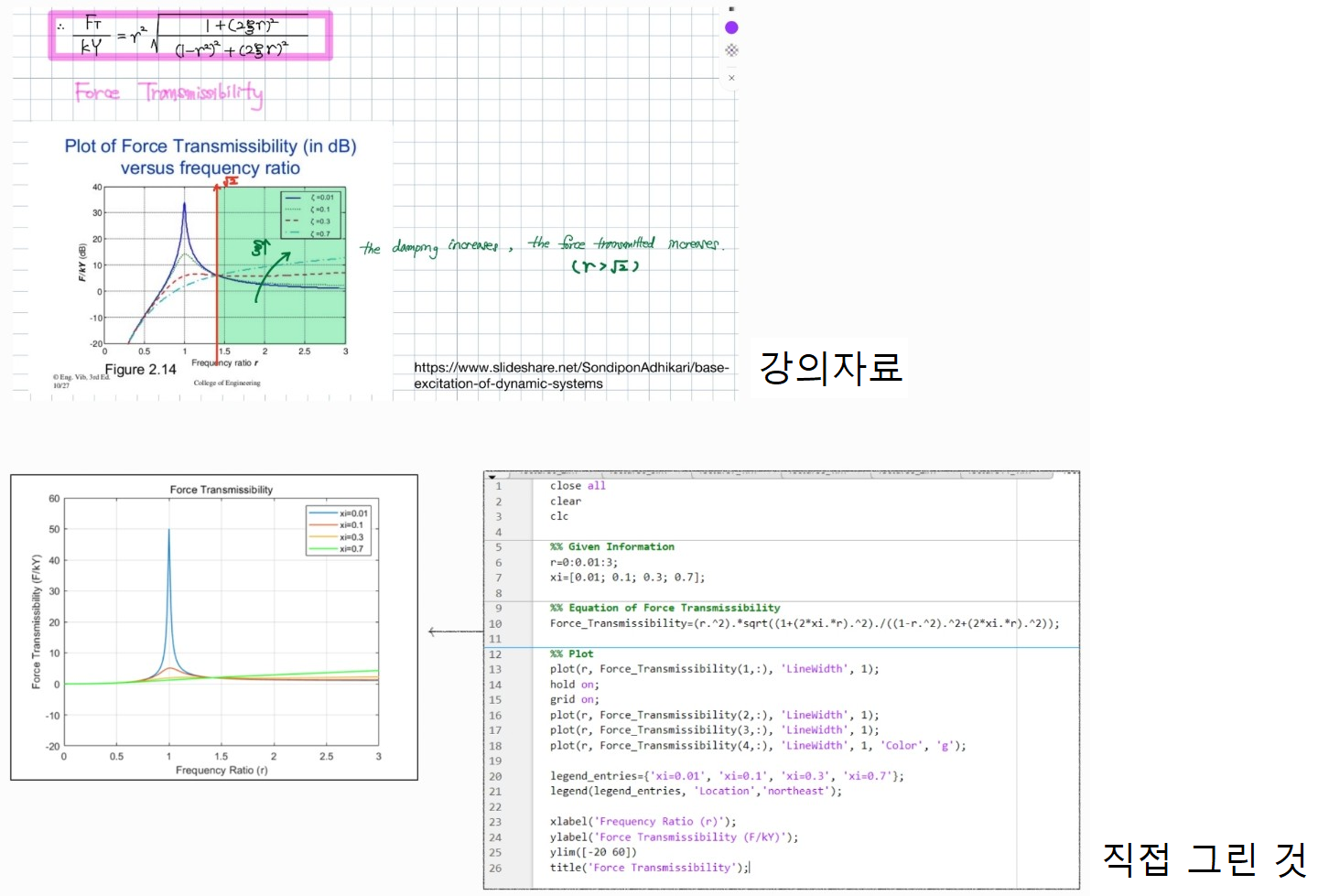 첨부한 사진에서 위의 사진은 강의자료의 Force Transmissibility 그래프이고 아래는 제가 직접 그린 Force Transmissibility 그래프와 코드입니다.