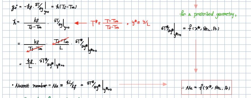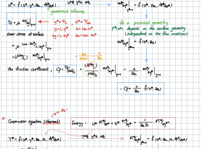 1. 위의 그림에서 누썰넘버 유도시에 u^*와 T^*를 초기에 연관변수 u (x,y, 등등)로 표기할때, velocity, energy equation에서 저렇게 변수를 명확하게 끌어낼 수 있는지 궁금합니다. 이부분이 잘 이해가안되어서요. dp/dx도 T^*에서 없는 변수 인데 추가한것도 이해가 가질않습니다.