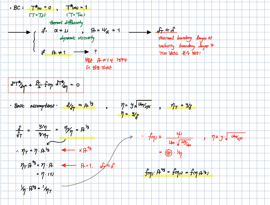1. thermal diffisivity (알파) = dynamic viscosity (뉴) 일때, Pr=1이되고, 여기서 델타(T)~델타 로 나타난다고 나와있습니다. 이 조건에서 열과 속도의 boundary layer의 크기가 거의 같다는 내용인데요. 이거는 이경우에 두 방정식이 거의 유사해져서 그렇게 표현하는건가요? 왜 이런건지 궁금합니다. 방정식의 경우도 velocity BL는 3차, thermal BL는 2차 미방이라서 잘 모르겠습니다.