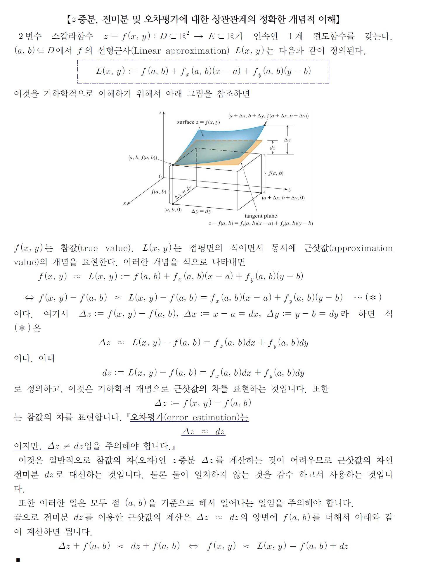 선형근사를 이용해서 함수를 값을 estimate하는데 dz ,전미분은, 근사값의 차이니깐 선형근사를 이용했을때의 오차가 전미분인 건가요?