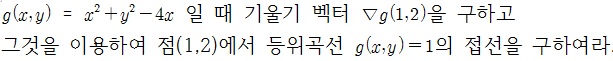 위 연습문제에서 요구하는, g(x,y)=1 등위곡선의 점(1,2)에서의 접선을 구하려면 등위곡선을 r=r(t) 여기서부터 좀 막힙니다. 풀이과정에 대해 설명을 해주실수 있으신지요..