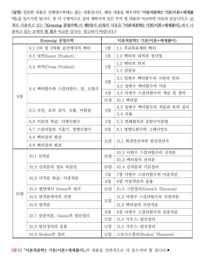 안녕하세요? 저는 임계수 교수님의 강의를 대학교 1학년 때부터 수강하고 있는 학생입니다. 저는 현재 학교에서 공학수학2 과목을 수강하고 있는데 [KREYSZIG 공업수학 10판 상(Advanced Engineering Mathematics,10th edition, 지은이: Erwin Kreyszig, 옮긴이: 서진헌, 심형보] 이 책으로 진도를 나가고 있습니다. 중간고사까지의 범위가 Chapter7선형대수:행렬, 벡터, 행렬식, 선형 연립방정식, Chapter8 선형대수: 행렬의 고유값 문제, 고유기저, 대각화여서 교수님의 선형대수학 과목을 수강하고 이번 중간고사 때 좋은 성적을 받을 수 있었습니다. 감사드립니다!! 그런데 이번 기말고사 범위가Chapter9 벡터미분, 기울기, 발산, 회전, 곡선,호의길이, 곡률, 역학 스칼라장의 기울기, 방향도함수, 벡터장의 발산, 스칼라장의 기울기,벡터장의 발산 벡터장의 회전, 벡터장의 회전 선적분, 이중적분, 그린의 정리, 면적분, 삼중적분, 가우스의 발산정리,스토스의 정리를 배운다는데 이 내용들은 교수님의 선형대수학 강의에 포함이 되어있는 것 같지 않아 교수님의 어떤 과목의 강의를 들어야 하는지 알고 싶습니다!! 제가 첨부한 사진에 8주차 부터가 이번 기말고사 시험범위 입니다!! 교수님의 어떤 강의를 들어야 하는지 알려주시면 열심히 수강하겠습니다!! 항상 감사드립니다! 답변 완료된 질문과 답변은 수정 및 삭제가 불가합니다. |