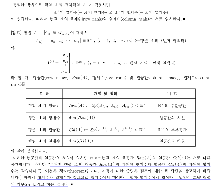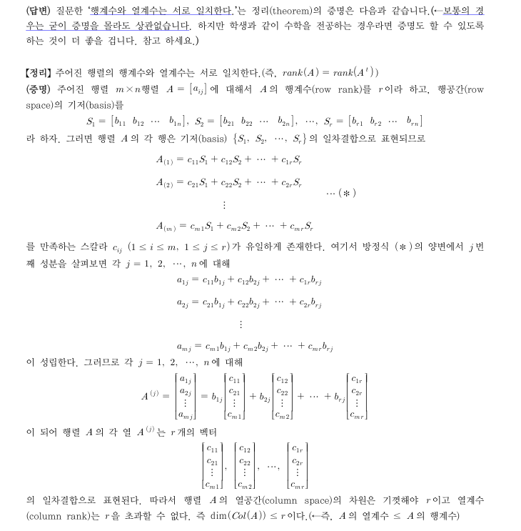 안녕하세요. 선형대수학 강의를 듣고 있는 수학교육과 학생입니다. 강의에서 행계수=열계수에 대해서 증명이 궁금해서 이 글을 작성합니다.