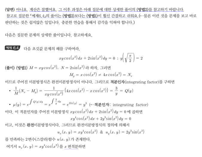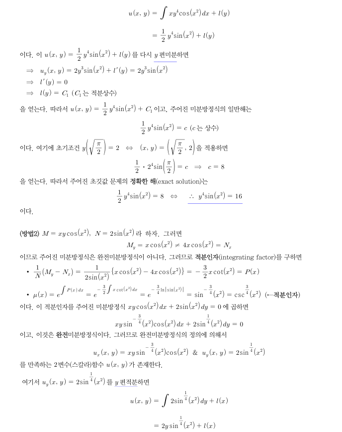 적분인자를 구해서 완전 미분방정식을 만들어 보려고 하니 식이 거창해져서 풀 엄두가 안납니다. 엄두가 안난다고 표현하긴 했지만, 정확히는 적분인자를 곱해준 식을 보았을때 식이 매우 복잡해서 적분인자를 잘못 구했나? 싶은데 적분인자를 구하는 과정에서는 잘못된 점이 없는것 같아서 혼란스럽습니다.