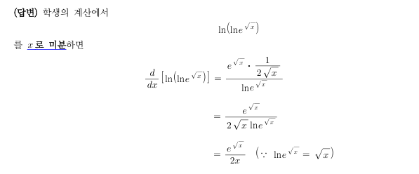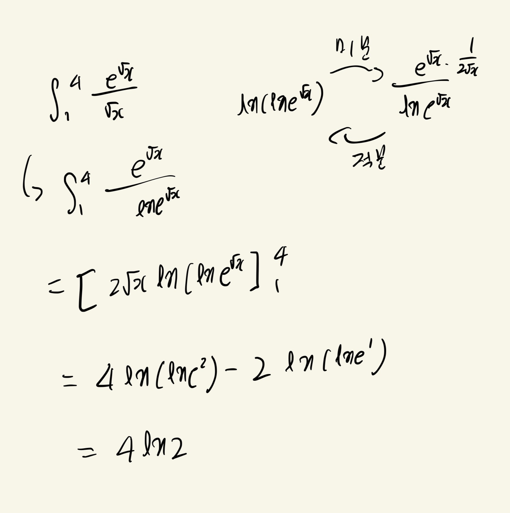 루트x를 t로 치환해서 x=t^2으로 푸는걸로 해결하긴 했습니다만 풀다가 사진처럼도 접근을 해봤는데 왜 저 접근이 틀린지 잘 모르겠습니다 루트x가 분모에 있으니 x는 0이아니고 양수면 저렇게 풀어도 풀이가 되어야 한다고 생각하는데 엉뚱한 답이 나와 질문드립니다 답변 완료된 질문과 답변은 수정 및 삭제가 불가합니다. |