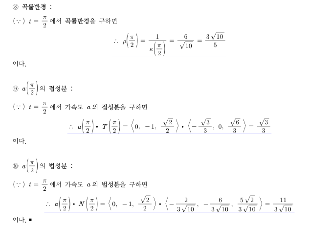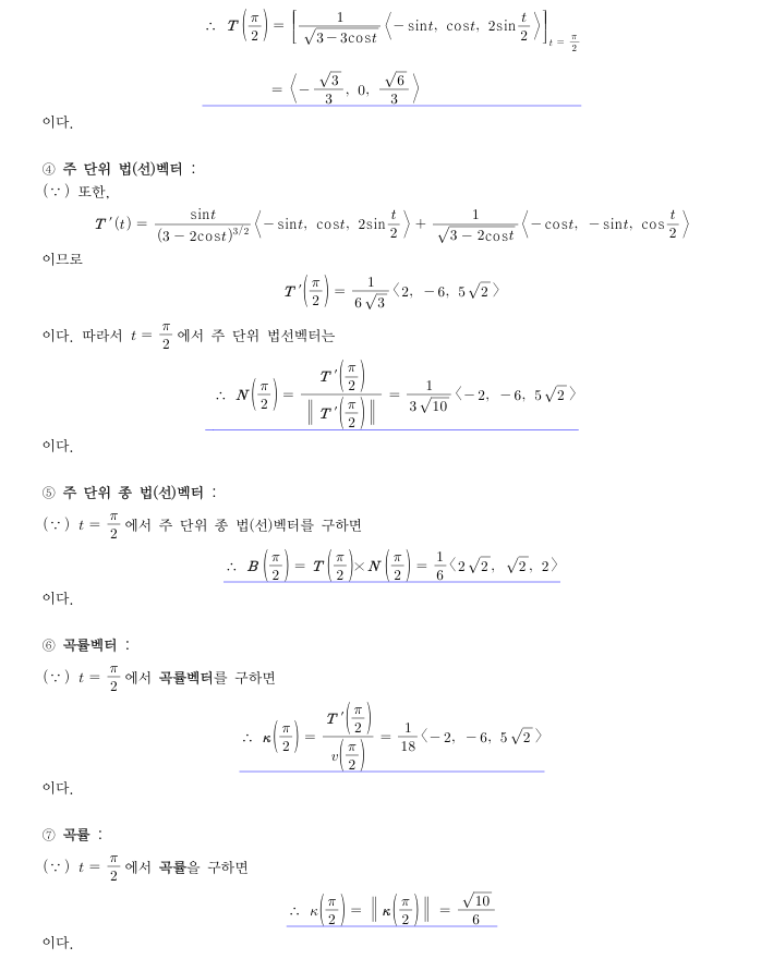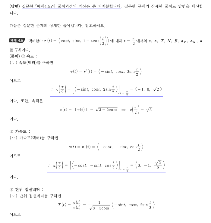예제 4.9번 벡터함수 <cost, sint, 1-4cos(t/2)>의 주법선벡터를 구하는 문제입니다. 계속 생각해보아도 답지와 다른 답이 나오게 되어 이렇게 질문드립니다.
