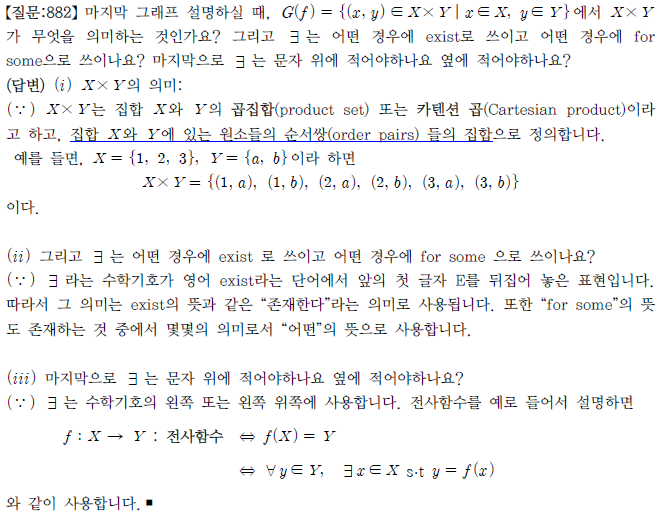 마지막 그래프 설명하실 때, G(f)={(x,y)X x Y l xX, yY} 에서 X x Y 가 무엇을 의미하는 것인가요? 그리고 ∃ 어떤 경우에 exist 로 쓰이고 어떤 경우에 for some 으로 쓰이나요? 마지막으로 ∃ 는 문자 위에 적어야하나요 옆에 적어야하나요? 답변 완료된 질문과 답변은 수정 및 삭제가 불가합니다. |
