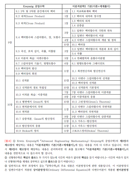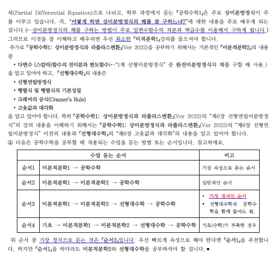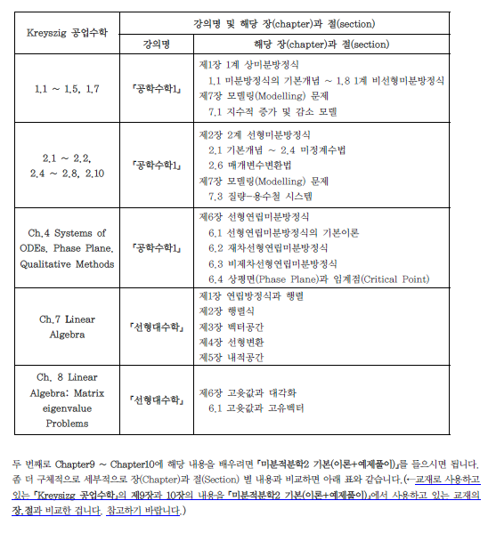 안녕하세요. 현재 교수님 강의를 통해 공업수학을 수강 중인 학생입니다. 다름이 아니라, 제가 학교에서 사용하는 교재인 Erwin Kreyszig의 Advanced Engineering Mathematics의 목차와 교수님 교재의 구성 사이에 일부 차이가 있어 문의드리고자 합니다. 이전까지는 두 교재의 순서가 거의 동일하여 학습에 큰 어려움이 없었습니다. 그러나 Chapter 4, 그리고 Chapter 7~10 부분에서 순서와 구성에 차이가 있는 것을 확인하였습니다. 이에 해당 챕터들이 교수님 강의 및 교재에서는 각각 어느 부분에 해당하는지 알고 싶습니다. 또한, 학교 수업을 따라가기 위해 해당 내용을 순서를 바꿔 학습하는 것이 가능한지, 가능하다면 어떤 순서로 학습하는 것이 효율적인지도 함께 조언해주시면 감사하겠습니다. 답변 완료된 질문과 답변은 수정 및 삭제가 불가합니다. |