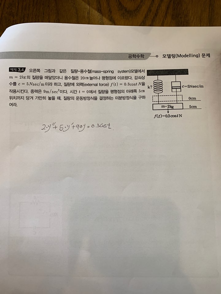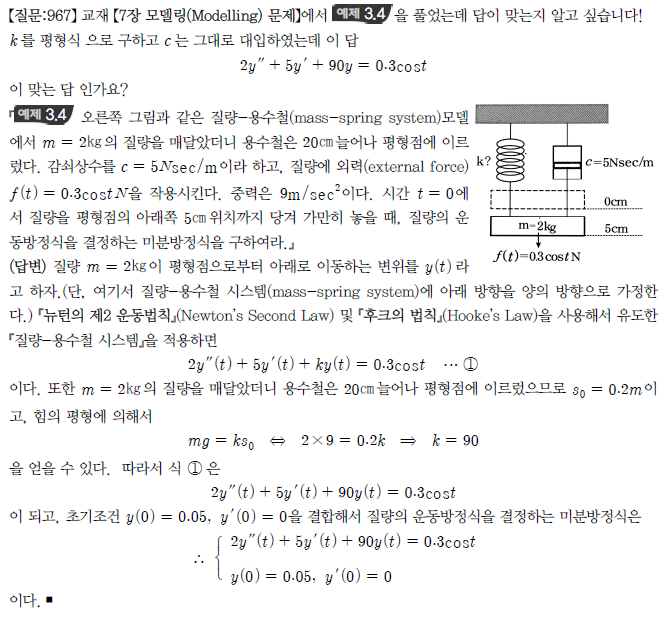 교제 7장 매스스프링 예제 3.4를 풀었는데 답이 맞는지 알고 싶습니다! k를 평형식 으로 구하고 c는 그대로 대입하였는데 이답이 맞는답인가요?