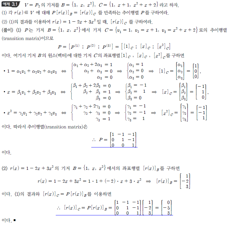 4.3 기저의 변환과 행렬의 닮음 예제3.1, 예제3.2 풀이좀 올려주실수 있나요? 답변 완료된 질문과 답변은 수정 및 삭제가 불가합니다. |
