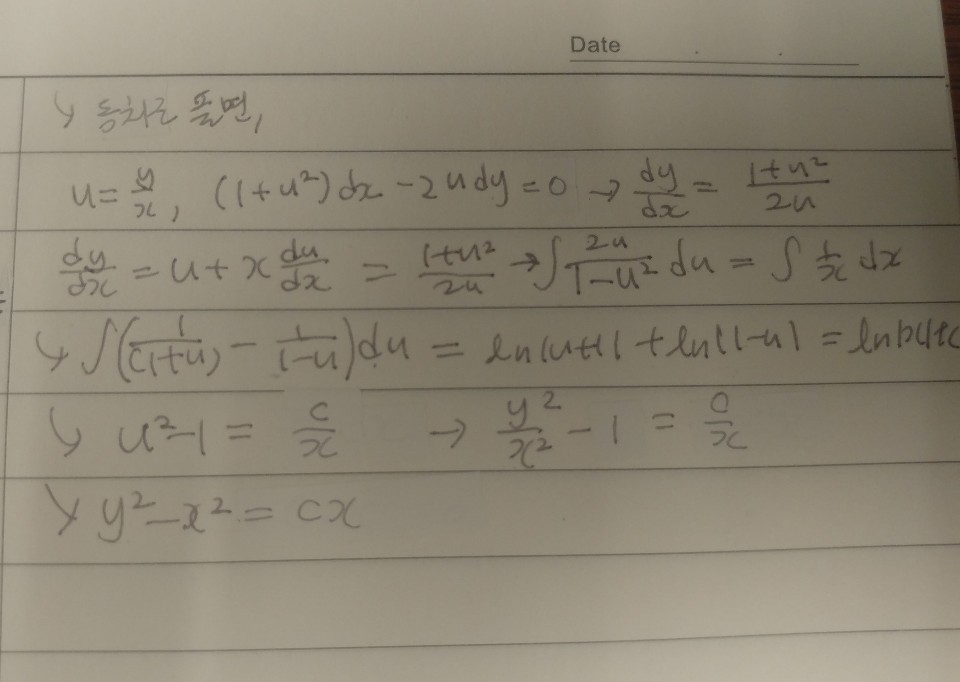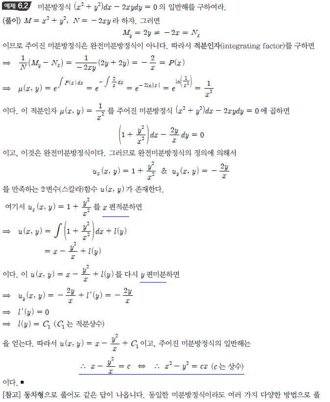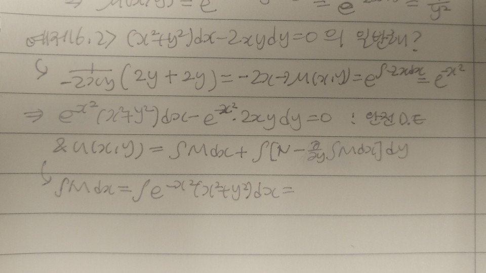 안녕하세요 교수님 예제 6.2 질문이 생겨 글올립니다. 적분인자단원의 문제인 만큼 적분인자를 이용하여 완전미분방정식을 만들고 문제를 풀어보았는데요. 제 풀이과정 중 잘못된 부분이 있는 것인지 너무 복잡한 적분이 나왔습니다. 제가 알기로는 x^2*e^(-x^2)를 적분하려면 감마펑션을 알아야하는데 잘못알고있는 걸까요? 아니면 계산과정중 어딘가 잘못된 부분이 있는 것일텐데 어디가 오류인지 알려주시면 감사하겠습니다. 그리고 이 문제는 다음과 같이 동차로 푸는 것이 더 적절하지 않나 생각이 드는데 맞나요?