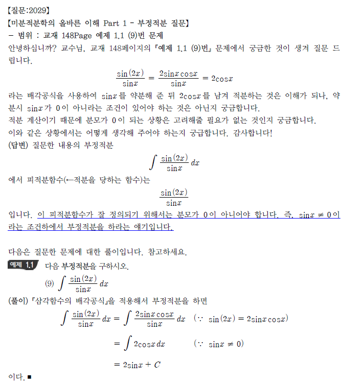 안녕하십니까 교수님, 교재 148페이지의 예제 1.1, (9)번 문제에서 궁금한 것이 생겨 질문드립니다. sin2x/sinx=2sinxcosx/sinx=2cosx라는 배각공식을 사용하여 sinx를 약분해 준 뒤 2cosx를 남겨 적분하는 것은 이해가 되나, 약분 시 sinx가 0이 아니라는 조건이 있어야 하는 것은 아닌지 굼금합니다. 적분 계산이기 때문에 분모가 0이 되는 상황은 고려해줄 필요가 없는 것인지 궁금합니다. 답변 완료된 질문과 답변은 수정 및 삭제가 불가합니다. |