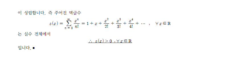 그런데 그것은 s(0)나 s(1)가 0이 아니라는 것을 보여줄 뿐 실수 전체 범위에서 s(x)가 0이 아니라는 것을 보여주는 것은 아니지 않나요? 어떻게 s(x)=0이 아니라고 결론지어줄 수 있는지 궁금합니다. 답변 완료된 질문과 답변은 수정 및 삭제가 불가합니다. |