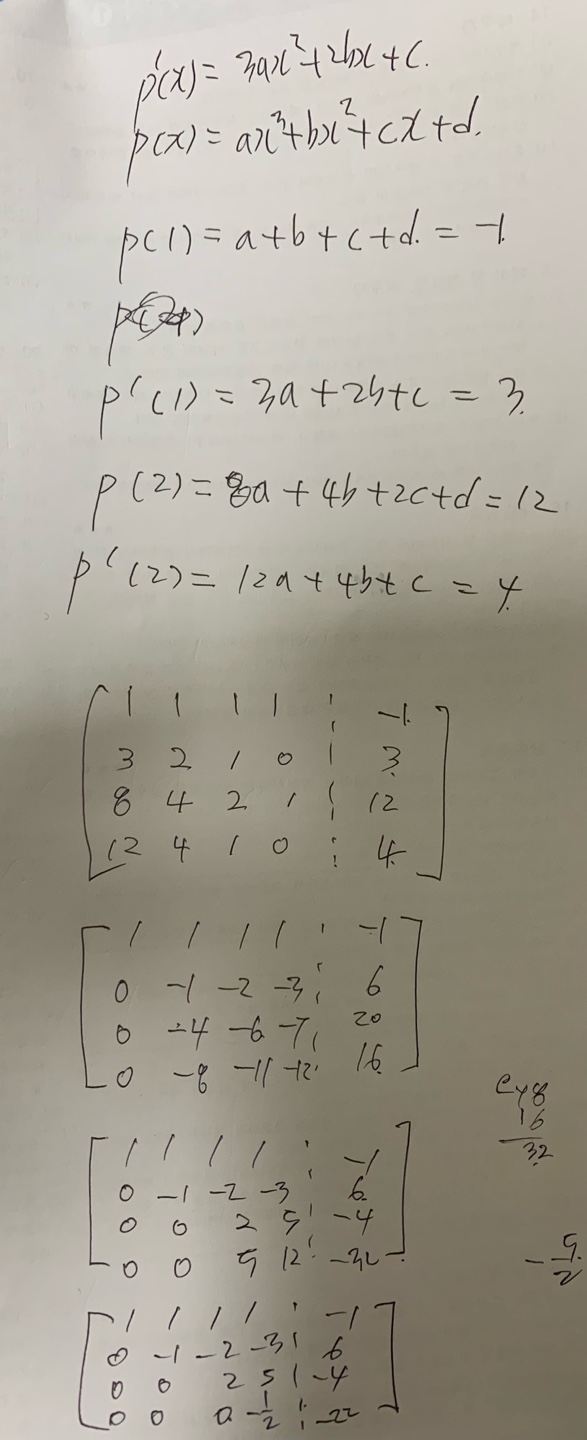 첨부된 파일 보시면 저는 우선 p(x)와 p`(x) 두 개를 구해서 p(1) ,, p`(2)까지 구했습니다. 그 후 a, b, c, d를 새로운 변수라고 생각하여 a,b,c,d의 계수들을 행렬화 하여 a,b,c,d를 구했습니다. 그 후 다시 p(x)에 대입하였는데 혹시 잘못된 부분이 어디인가요? 해설을 보고 싶습니다. 그리고 강의중에 다루어주시지 않은 문제들에 대한 해설은 어디서 알 수 있을까요? 답변 완료된 질문과 답변은 수정 및 삭제가 불가합니다. |