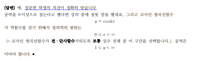 역함수를 가지려면 전단사함수여야 하잖아요. 전사함수이려면 치역이랑 공역이 같아야 하는데, cosh 함수같은 경우는 정의역이 모든 실수, 치역이 1이상인 실수니까 공역을 0 이상으로 잡는다고 하셨는데, 그럼 치역이랑 공역이 다른게 되는거 아닌가요? 공역도 1 이상이어야 되지 않나요? 답변 완료된 질문과 답변은 수정 및 삭제가 불가합니다. |