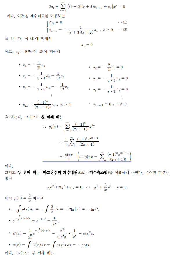 계수비교까지 하고나니 해의 기저가 자꾸 sinx, cox 가 나오는데 답지엔 sinx/x, cos/x 가 나와있길래 질문드립니다 ㅠ 아직 급수해 부분이 미숙해서 어디서 잘못된지 조차 모르겠습니다..! 자꾸 질문드려서 죄송합니다 ㅠ